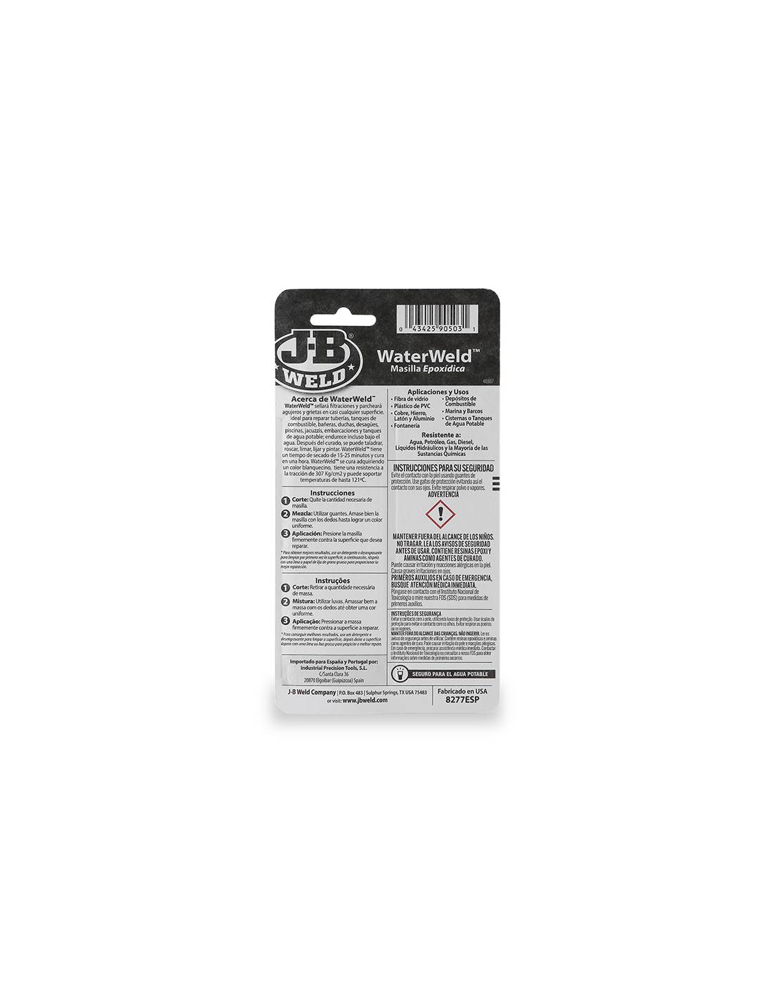Gracias a su facilidad de uso, aplicación directa bajo el agua y alta resistencia mecánica, J-B Weld 8277ESP WaterWeld es la solución ideal para reparaciones de emergencia y mantenimiento en entornos húmedos o sumergidos, ofreciendo un sellado confiable y duradero.